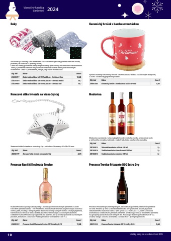 10Viano%u010dn%u00fd katal%u00f3gdar%u010dekov 2024v%u0161etky ceny s%u00fa uveden%u00e9 bez DPHKeramick%u00fd hrn%u010dek s bambusovou t%u00e1ckouVysoko kvalitn%u00fd keramick%u00fd hrn%u010dek s bambusovou t%u00e1ckou a viano%u010dn%u00fdm dizajnom, 370 ml. V kraftovej papierovej krabici.Obj. k%u00f3d N%u00e1zov Cena %u20acXM053805 Keramick%u00fd hrn%u010dek s bambusovou t%u00e1ckou 370 ml 7,45Prosecco Ros%u00e9 Millesimato TrevisoRu%u017eov%u00e9 Prosecco jasnej ru%u017eovej farby s osvie%u017euj%u00facim intenz%u00edvnym perlen%u00edm. Cuv%u00e9etvor%u00ed 85% odroda Glera a 15% Pinot Nero. Toto %u0161umiv%u00e9 v%u00edno V%u00e1s zaujme svojou ovocnouv%u00f4%u0148ou jab%u013ak, hru%u0161ky a lesn%u00fdch jah%u00f4d doplnen%u00e1 o t%u00f3ny l%u00fa%u010dnych kvetov. Chu%u0165 je pr%u00edjemn%u00e1,harmonick%u00e1 s v%u00f4%u0148ou a v%u010faka dobrej kyselinke dlhotrvaj%u00faca s ovocn%u00fdm z%u00e1verom.Delik%u00e1tne ru%u017eov%u00e9 Prosecco je v%u00fdborn%u00e9 ako aperit%u00edv, ale aj skvel%u00fd spolo%u010dn%u00edk ku morsk%u00fdmplodom, krevet%u00e1m a lososovi. Pod%u00e1vajte dobre vychladen%u00e9 ( 6-8 %u00b0C ).Obj. k%u00f3d N%u00e1zov Cena %u20acXM005533 Prosecco Ros%u00e9 Millesimato Treviso DOC Extra Dry 0,75l 11,80Nerezov%u00e9 sitko hviezda na viano%u010dn%u00fd %u010dajNerezov%u00e9 sitko hviezda na viano%u010dn%u00fd %u010daj s retiazkou. Rozmery: 65%u00d758%u00d720 mm.Obj. k%u00f3d N%u00e1zov Cena %u20acXM845191 Nerezov%u00e9 sitko hviezda na viano%u010dn%u00fd %u010daj 2,74MedovinaMedovina vyroben%u00e1 z toho najlep%u0161ieho slovensk%u00e9ho medu, priezra%u010dnej vodya vi%u0161%u0148ov%u00e9ho extraktu, byliniek z na%u0161ich l%u00fak alebo orechov%u00e9ho extraktuObj. k%u00f3d N%u00e1zov Cena %u20acXM180013 Tatransk%u00e1 medovina vi%u0161%u0148ov%u00e1 500 ml 5,-XM180014 Tradi%u010dn%u00e1 medovina staroslovensk%u00e1 500 ml 5,-XM180015 Tradi%u010dn%u00e1 medovina orechov%u00e1 500 ml 5,-Prosecco Treviso Frizzante DOC Extra DryProsecco Frizzante je ur%u010den%u00e9 pre t%u00fdch, ktor%u00ed ob%u013eubuj%u00fa menej intenz%u00edvne perlenievo v%u00edne. Hrozno aj v%u00edno sa dor%u00e1ba takisto ako pri Spumante, akur%u00e1t je processekund%u00e1rneho kvasenia krat%u0161%u00ed a t%u00fdm aj tlak CO2 ni%u017e%u0161%u00ed ( 2,5 %u2013 3,5 atm ). Ovocn%u00e1aromatika a svie%u017ea chu%u0165 s jemn%u00fdm perlen%u00edm predur%u010duj%u00fa v%u00edno za vhodn%u00e9ho partnerana gril p%u00e1rty po%u010das hor%u00facich letn%u00fdch dn%u00ed. Pod%u00e1vajte dobre vychladen%u00e9 ( 6-8 %u00b0C ).Zna%u010dka Soligo. Ovocn%u00e1 aromatika a svie%u017ea chu%u0165 s jemn%u00fdm perlen%u00edm.Obj. k%u00f3d N%u00e1zov Cena %u20acXM015533 Prosecco Treviso Frizzante DOC Extra Dry 0,75 l 9,60DekyA%u017e zacinkaj%u00fa rolni%u010dky a do mraziv%u00e9ho r%u00e1na sa v%u00e1m z vyhriatej postele nebude chcie%u0165, pozn%u00e1te, %u017ee Vianoce sa pomaly bl%u00ed%u017eia!Deka m%u00e1 v%u0161etky potrebn%u00e9 atesty a sp%u013a%u0148a v%u0161etky po%u017eiadavky na zdravotn%u00fa nez%u00e1vadnos%u0165. Sta%u010d%u00ed ju ponecha%u0165 cez de%u0148 na priamom slne%u010dnom svetle alebo pod vn%u00fatorn%u00fdm osvetlen%u00edm. Deka sa prirodzene %u201enabije%u201c, aby ve%u010der mohla %u017eiari%u0165.Obj. k%u00f3d N%u00e1zov Cena %u20acXM225011 Deka z mikrovl%u00e1kna Soft 150 x 200 cm - Christmas Time 13,28XM231874 Deka z mikrovl%u00e1kna Soft 150 x 200 cm - svietiaca modr%u00e1 15,-XM229688 Deka z mikrovl%u00e1kna Soft 150 x 200 cm - svietiaca siv%u00e1 15,-