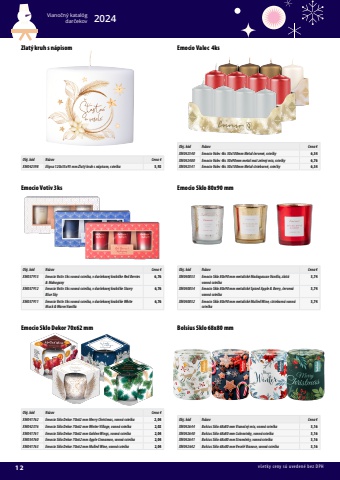 12Viano%u010dn%u00fd katal%u00f3gdar%u010dekov 2024v%u0161etky ceny s%u00fa uveden%u00e9 bez DPHZlat%u00fd kruh s n%u00e1pisomObj. k%u00f3d N%u00e1zov Cena %u20acXM042598 Elipsa 120x55x95 mm Zlat%u00fd kruh s n%u00e1pisom, svie%u010dka 5,92Emocio Votiv 3ksObj. k%u00f3d N%u00e1zov Cena %u20acXM037913 Emocio Votiv 3ks vonn%u00e1 svie%u010dka, v dar%u010dekovej krabi%u010dke Red Berries & Mahogany6,76XM037912 Emocio Votiv 3ks vonn%u00e1 svie%u010dka, v dar%u010dekovej krabi%u010dke Starry Blue Sky6,76XM037911 Emocio Votiv 3ks vonn%u00e1 svie%u010dka, v dar%u010dekovej krabi%u010dke White Musk & Warm Vanilla6,76Emocio Sklo Dekor 70x62 mmObj. k%u00f3d N%u00e1zov Cena %u20acXM041762 Emocio Sklo Dekor 70x62 mm Merry Christmas, vonn%u00e1 svie%u010dka 2,04XM042376 Emocio Sklo Dekor 70x62 mm Winter Village, vonn%u00e1 svie%u010dka 2,02XM041761 Emocio Sklo Dekor 70x62 mm Golden Wings, vonn%u00e1 svie%u010dka 2,04XM034760 Emocio Sklo Dekor 70x62 mm Apple Cinnamon, vonn%u00e1 svie%u010dka 2,04XM041763 Emocio Sklo Dekor 70x62 mm Mulled Wine, vonn%u00e1 svie%u010dka 2,04Emocio Valec 4ksObj. k%u00f3d N%u00e1zov Cena %u20acXM042540 Emocio Valec 4ks 50x100mm Metal %u010derven%u00e9, svie%u010dky 6,34XM042480 Emocio Valec 4ks 50x90mm metal mat zelen%u00fd mix, svie%u010dky 6,76XM042541 Emocio Valec 4ks 50x100mm Metal strieborn%u00e9, svie%u010dky 6,34Emocio Sklo 80x90 mmObj. k%u00f3d N%u00e1zov Cena %u20acXM040053 Emocio Sklo 80x90 mm metalick%u00e9 Madagascan Vanilla, zlat%u00e1 vonn%u00e1 svie%u010dka3,74XM040054 Emocio Sklo 80x90 mm metalick%u00e9 Spiced Apple & Berry, %u010derven%u00e1 vonn%u00e1 svie%u010dka3,74XM040052 Emocio Sklo 80x90 mm metalick%u00e9 Mulled Wine, strieborn%u00e1 vonn%u00e1 svie%u010dka3,74Bolsius Sklo 68x80 mmObj. k%u00f3d N%u00e1zov Cena %u20acXM042644 Bolsius Sklo 68x80 mm Viano%u010dn%u00fd mix, vonn%u00e1 svie%u010dka 3,16XM042640 Bolsius Sklo 68x80 mm Cukrovinky, vonn%u00e1 svie%u010dka 3,16XM042641 Bolsius Sklo 68x80 mm Strom%u010deky, vonn%u00e1 svie%u010dka 3,16XM042642 Bolsius Sklo 68x80 mm Vesel%u00e9 Vianoce, vonn%u00e1 svie%u010dka 3,16