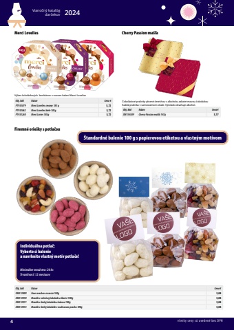 4Viano%u010dn%u00fd katal%u00f3gdar%u010dekov 2024v%u0161etky ceny s%u00fa uveden%u00e9 bez DPHFiremn%u00e9 orie%u0161ky s potla%u010douObj. k%u00f3d N%u00e1zov Cena %u20acXM513009 Zmes orechov a ovocia 100g 5,04XM513010 Mandle v mlie%u010dnej %u010dokol%u00e1de a %u0161korici 100g 5,04XM513011 Mandle v bielej %u010dokol%u00e1de a kokose 100g 5,04XM513013 Mandle v bielej %u010dokol%u00e1de v malinovom prachu 100g 5,04Individu%u00e1lna potla%u010d: Vyberte si balenie a navrhnite vlastn%u00fd mot%u00edv potla%u010de!Minim%u00e1lne mno%u017estvo: 20 ksTrvanlivos%u0165: 12 mesiacov%u0160tandardn%u00e9 balenie 100 g s papierovou etiketou a vlastn%u00fdm mot%u00edvomCherry Passion ma%u0161%u013ea%u010cokol%u00e1dov%u00e9 pralinky plnen%u00e9 %u010dere%u0161%u0148ou v alkohole, zaliate tmavou %u010dokol%u00e1douKa%u017ed%u00e1 pralinka v samostatnom obale. V%u00fdrobok obsahuje alkohol.Obj. k%u00f3d N%u00e1zov Cena %u20acXM154389 Cherry Passion ma%u0161%u013ea 147g 5,17Merci LoveliesV%u00fdber %u010dokol%u00e1dov%u00fdch bonb%u00f3nov v novom balen%u00ed Merci LoveliesObj. k%u00f3d N%u00e1zov Cena %u20acPT933079 Merci Lovelies creamy 185 g 5,72PT933062 Merci Lovelies biele 185g 5,72PT453268 Merci Lovies 185g 5,72