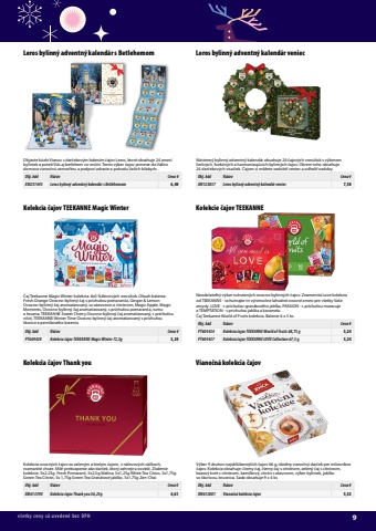 v%u0161etky ceny s%u00fa uveden%u00e9 bez DPH 9Leros bylinn%u00fd adventn%u00fd kalend%u00e1r s BetlehemomObjavte k%u00fazlo Vianoc s dar%u010dekov%u00fdm balen%u00edm %u010dajov Leros, ktor%u00e9 obsahuje 24 zmes%u00ed byliniek a pote%u0161%u00ed V%u00e1s aj betlehem vo vn%u00fatri. Tento v%u00fdber %u010dajov prinesie do V%u00e1%u0161ho domova viano%u010dn%u00fa atmosf%u00e9ru a podpor%u00ed zdravie a pohodu Va%u0161ich bl%u00edzkych.Obj. k%u00f3d N%u00e1zov Cena %u20acXM251445 Leros bylinn%u00fd adventn%u00fd kalend%u00e1r s Betlehemom 6,48Kolekcia %u010dajov TEEKANNE Magic Winter%u010caj Teekanne Magic Winter kolekcia. 6x5 N%u00e1levov%u00fdch vrec%u00fa%u0161ok. Obsah balenia: Fresh Orange Ovocno-bylinn%u00fd %u010daj s pr%u00edchu%u0165ou pomaran%u010da, Ginger & Lemon Ovocno-bylinn%u00fd %u010daj aromatizovan%u00fd, so z%u00e1zvorom a citr%u00f3nom, Magic Apple, Magic Moments, Ovocno-bylinn%u00fd %u010daj aromatizovan%u00fd, s pr%u00edchu%u0165ou pomaran%u010da, rumu a hrozna, TEEKANNE Sweet Cherry Ovocno-bylinn%u00fd %u010daj aromatizovan%u00fd, s pr%u00edchu%u0165ou vi%u0161n%u00ed, TEEKANNE Winter Time Ovocno bylinn%u00fd %u010daj aromatizovan%u00fd s pr%u00edchu%u0165ou %u0161korice a pern%u00edkov%u00e9ho koreniaObj. k%u00f3d N%u00e1zov Cena %u20acPT604428 Kolekcia %u010dajov TEEKANNE Magic Winter 72,5g 5,24Leros bylinn%u00fd adventn%u00fd kalend%u00e1r veniecN%u00e1stenn%u00fd bylinn%u00fd adventn%u00fd kalend%u00e1r obsahuje 24 %u010dajov%u00fdch vrec%u00fa%u0161ok s v%u00fdberom lie%u010div%u00fdch, funk%u010dn%u00fdch a harmonizuj%u00facich bylinn%u00fdch %u010dajov. Okrem toho obsahuje 24 dar%u010dekov%u00fdch visa%u010diek. %u010cajom si m%u00f4%u017eete ozdobi%u0165 veniec a odhali%u0165 ozdoby.Obj. k%u00f3d N%u00e1zov Cena %u20acXM123857 Leros bylinn%u00fd adventn%u00fd kalend%u00e1r veniec 7,58Kolekcia %u010dajov Thank youKolekcia ovocn%u00fdch %u010dajov zo zelen%u00fdm a bielym %u010dajom, v n%u00e1levov%u00fdch s%u00e1%u010dkoch, rozmanit%u00e9 chute. Mil%u00e9 prekvapenie ako dar%u010dek, ktor%u00fd zahreje a osvie%u017ei. Zlo%u017eenie kolekcie: 5x2,25g Fresh Pomaran%u010d, 5x2,5g Malina, 5x1,25g White Tea Citrus, 5x1,75gGreen Tea Citr%u00f3n, 5x 1,75g Green Tea Gran%u00e1tov%u00e9 jablko, 5x1,75g Zen-ChaiObj. k%u00f3d N%u00e1zov Cena %u20acXM613590 Kolekcia %u010dajov Thank you 56,25g 4,61Viano%u010dn%u00e1 kolekcia %u010dajovV%u00fdber 9 druhov najob%u013e%u00fabenej%u0161%u00edch %u010dajov 66 g, ide%u00e1lny viano%u010dn%u00fd dar%u010dek pre milovn%u00edkov%u010dajov. Kolekcia obsahuje: %u010dierny %u010daj, %u010dierny %u010daj s citr%u00f3nom, zelen%u00fd %u010daj s citr%u00f3nom, bazov%u00fd kvet s citr%u00f3nom, kamilkov%u00fd, citr%u00f3n s z%u00e1zvorom, v%u00fdber byliniek, jablko so %u0161koricou, brusnica. Sada obsahuje 9 x 4 ksObj. k%u00f3d N%u00e1zov Cena %u20acXM612001 Viano%u010dn%u00e1 kolekcia %u010dajov 5,52Kolekcie %u010dajov TEEKANNENeodolate%u013en%u00fd v%u00fdber ochuten%u00fdch ovocno-bylinn%u00fdch %u010dajov. Znamenit%u00e1 Love kolekcia od TEEKANNE - ochutnajte tri v%u00fdnimo%u010dne lahodn%u00e9 ovocn%u00e9 zmesi pre v%u0161etky Va%u0161e zmysly. LOVE - s pr%u00edchu%u0165ou gran%u00e1tov%u00e9ho jablka, PASSION - s pr%u00edchu%u0165ou maracuje a TEMPTATION - s pr%u00edchu%u0165ou jablka a karamelu. %u010caj Teekanne World of Fruits kolekcia. Balenie 6 x 5 ks.Obj. k%u00f3d N%u00e1zov Cena %u20acPT604424 Kolekcia %u010dajov TEEKANNE World of Fruits 68,75 g 5,24PT604427 Kolekcia %u010dajov TEEKANNE LOVE Collection 67,5 g 5,24