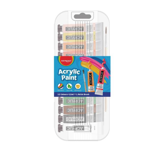 Akrylové, živé farby a silný pigment. Bezpečné pre deti, netoxické, v kovových rúrkach. Objem 12 x 12 ml. Farba: mix farieb.