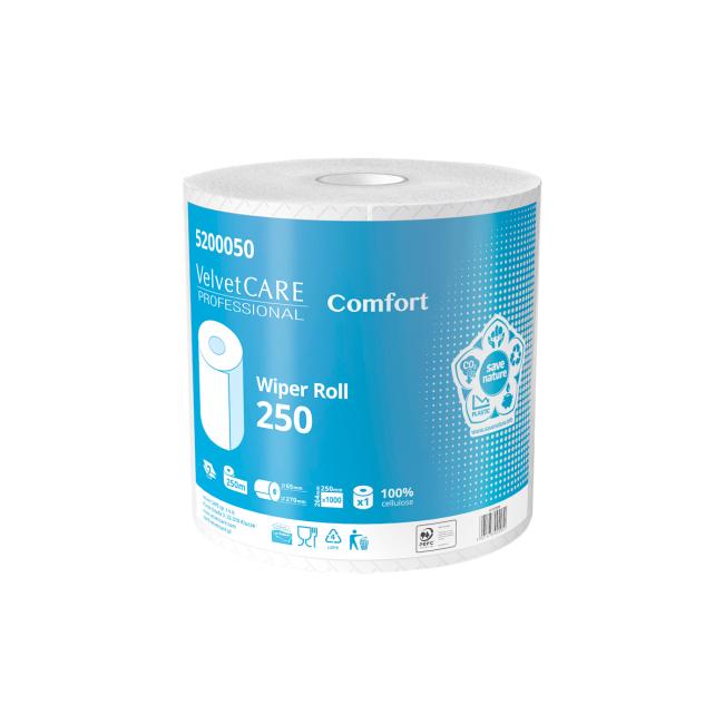 Jemná a silná 2-vrstvová priemyselná čistiaca handra Velvet CARE Professional Comfort 250 - obrovská rolka s 250 metrami a 1000 útržkami na každej rolke. Výška role 264 mm, 2 role v balení, 100 % celulóza