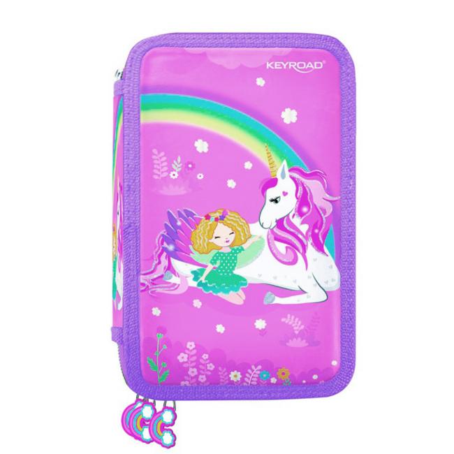 Školský peračník s výbavou, 52 prvkov. V súprave: fixky 18 ks, ceruzkové pastelky (vrátane 3 metalických), jumbo ceruzka HB, ceruzka HB, guma, strúhadlo, plniace pero, 4 ks. Modré atramentové kazety, 2 ks. Plastové šablóny s písmenami (AM, NZ), pravítko 15 cm, uhlomer, nožnice 13 cm, držiak na ceruzku. Materiál PVC, zips, má tri komory. Rozmery: 20,5 x 13,5 x 6 cm. Farba: mix farieb, mix vzorov.