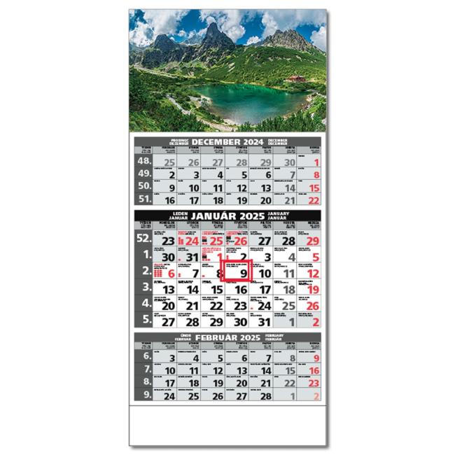 Plánovací kalendár s 3-mesačným kalendáriom s menami v SK + CZ, názvy mesiacov a dní v SK, CZ, EN, DE a HU