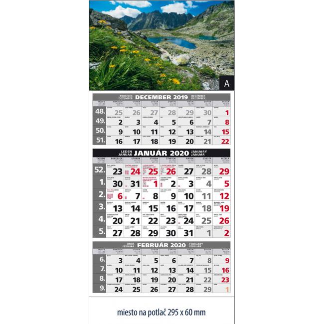 Rozmery: 295 x 663 mm. ROZSAH: 12 listov. KALENDÁRIUM: 3-mesačné s menami SK+CZ názvy mesiacov a dní v SK, CZ, UK, DE, HU. VÄZBA: šitá s perforáciou. REKLAMNÁ POTLAČ: 295 x 183 mm, 295 x 60 mm. BALENIE: 50 ks.