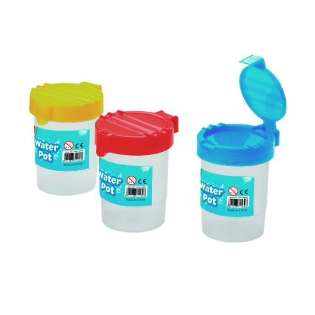 Praktický plastový pohár na vodu so zátkou proti rozliatiu a viečkom, určený školám a deťom, ktoré používajú doma vodou riediteľné farby. Objem: 150 ml. Farba: mix farieb.