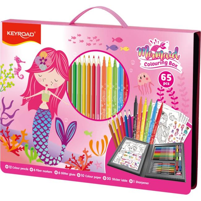 Prebuďte svoju umeleckú vášeň so sadou KEYROAD. 65 dielikov v praktickej krabičke s rúčkou. Sada je ideálna pre milovníkov umenia, mladých aj starých, ktorí sa chcú vyjadriť rôznymi spôsobmi. Obsah: 12 farebných ceruziek, 6 fixiek, 6 trblietavých lepidiel v tyčinkách, 10 omaľovánok, 30 nálepiek a strúhadlo. Balenie: krabička s rúčkou. Vzor: Morská panna. Farba: Ružová.