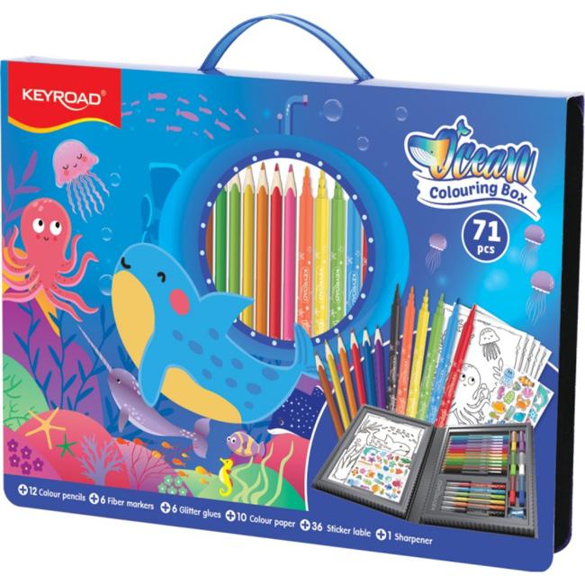 Prebuďte svoju umeleckú vášeň so sadou KEYROAD. 65 dielikov v praktickej krabičke s rúčkou. Sada je ideálna pre milovníkov umenia, mladých aj starých, ktorí sa chcú vyjadriť rôznymi spôsobmi. Obsah: 12 farebných ceruziek, 6 fixiek, 6 trblietavých lepidiel v tyčiniek, 10 omaľovánok, 30 nálepiek a strúhadlo. Balenie: krabička s rúčkou. Vzor: Oceán. Farba: Modrá.