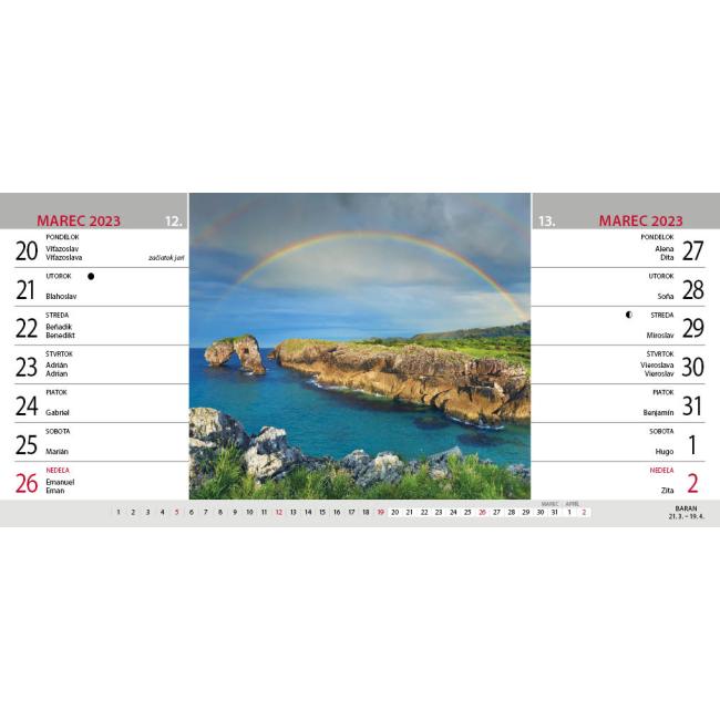 Objavujte krásy sveta priamo z pohodlia vášho pracovného stola! Tento praktický dvojtýždenný stolový kalendár vás počas celého roka prevedie tými najkrajšími a najzaujímavejšími miestami planéty - od exotických pláží, cez historické mestá až po nádherné prírodné scenérie. Každý list kalendára predstavuje novú destináciu doplnenú o nádhernú fotografiu a stručný popis miesta. Nech už plánujete dovolenku alebo len snívate pri káve, tento kalendár je skvelým spoločníkom na každý deň. Je to spojenie praktického plánovania s túžbou po dobrodružstve. Cestujte svetom vďaka každej otočenej strane kalendára.