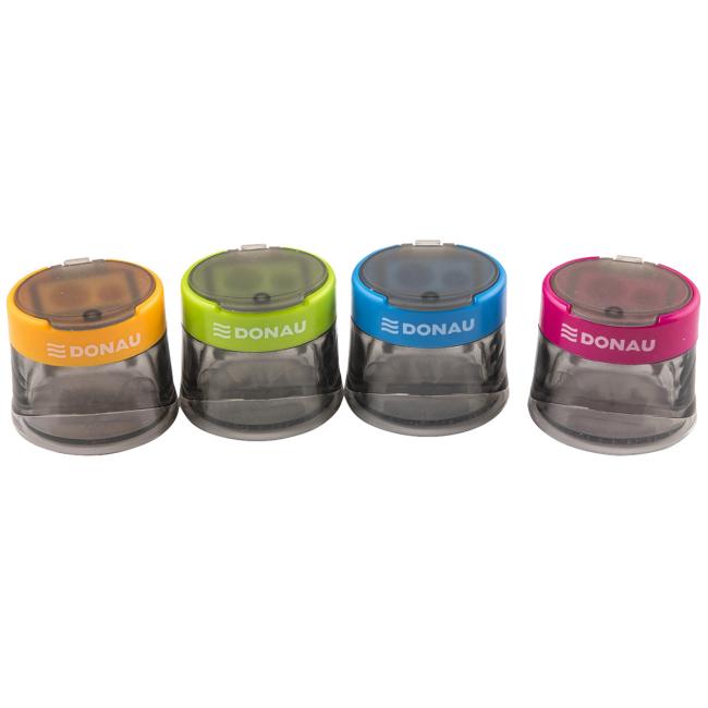 Dvojité strúhadlo na ceruzky s viečkom, pre pravákov, na ceruzky a farebné ceruzky s priemerom 8 mm a 12 mm, vhodné pre okrúhle, šesťuholníkové a trojuholníkové ceruzky, plastové puzdro, farebný výber: dymovo-ružová, dymovo-zelená, dymovo-modrá, dymovo-oranžová, čepeľ nie je vymeniteľná, ŠxVxH: 4,5 x 3,5 x 4,2 cm