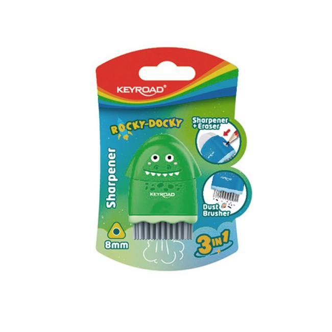 KEYROAD Rocky-Docky jednoduché plastové strúhadlo, šikovné a ľahko skladovateľné. So zábavnou potlačou, ktorá upúta pozornosť. Kombinuje tri funkcie: strúhadlo, gumu a štetec a vďaka tejto jedinečnej kombinácii je mimoriadne praktický na každodenné použitie. Priemer otvoru: 8 mm. Balenie: blister. Farba: mix farieb.