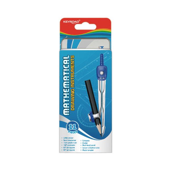 Školská matematická súprava v kovovom puzdre, 11 kusov vyrobených z odolného materiálu, vysoko kvalitné produkty. Sada obsahuje: kružidlo, biela guma, strúhadlo, 180° uhlomer, 15 cm plastové pravítko, tabuľka rozvrhu hodín, plastová šablóna s číslami a písmenami, 45° plastový trojuholník, 60° plastový trojuholník, čierna ceruzka. Mix farieb.