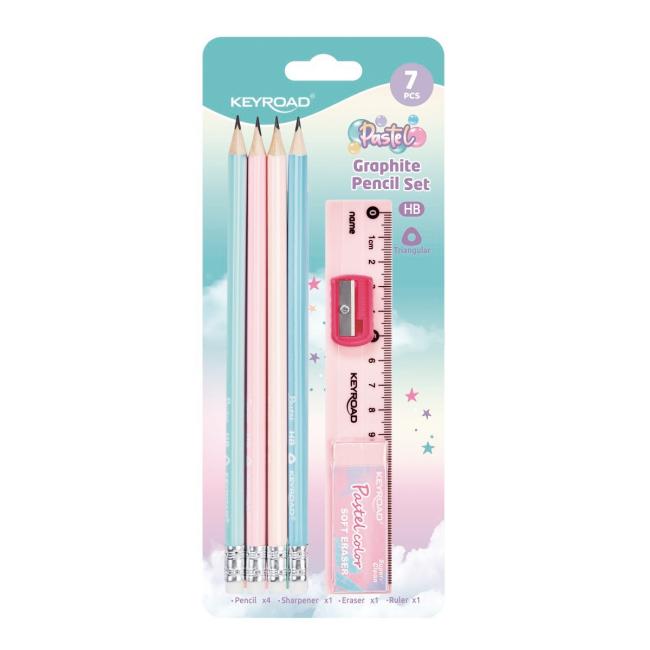 Súprava pastelových grafitových ceruziek KEYROAD - 7 ks: grafitová ceruzka, trojuholníková, s gumou - 4 ks, strúhadlo plastové - 1 ks, mäkká guma - 1 ks, plastové pravítko 20 cm - 1 ks. Balenie: blister. Farba: mix farieb.