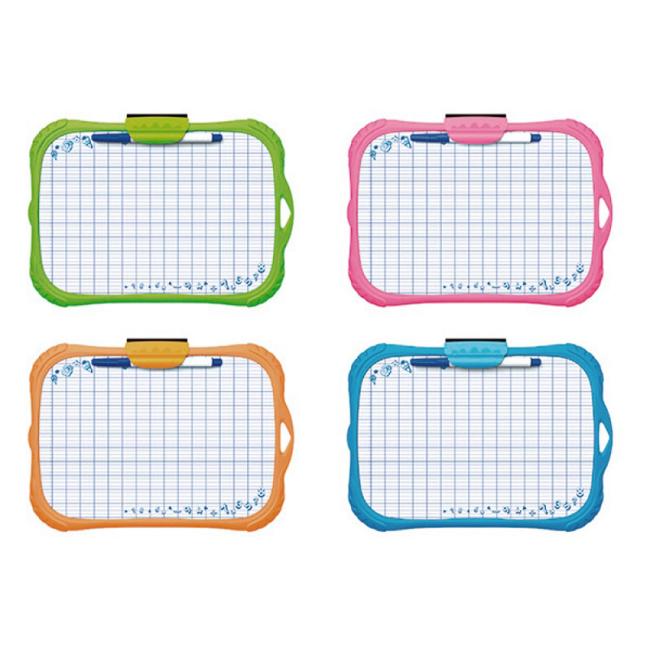 Tabuľka KEYROAD Mini na sucho stierateľná, obojstranné (hladká/kockovaná). Protipraskavý náter, flexi, umývateľný, farebné gumené rámy. Fixka a mini hubka súčasťou balenia. Závesná konzola, rozmer: 205x287x17mm. Farba dosky: biela, farba rámu: mix farieb.