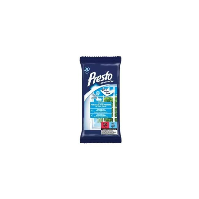 PRESTO CLEAN VLHČENÉ UTIERKY - SKLO a ZRKADLO 30 ks. Univerzálne utierky Presto sú určené na čistenie sklenených povrchov. Účinne odstraňuju nečistoty, mastnotu a zabraňujú usadzovaniu prachu.
