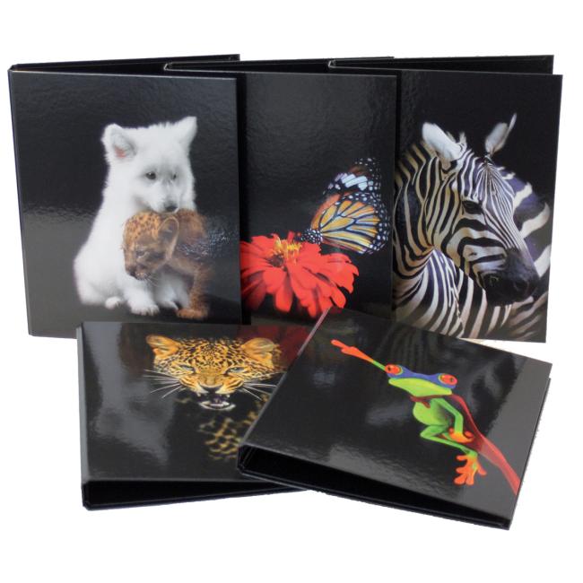 Zakladač krúžkový, 5 rôznych vzorov zvierat (2 z každého), vo vnútri s čirnobielou potlačou, pre formát DIN A4, 2 krúžky, priemer krúžku 25 mm, lesklý laminovaný papierový povrch.