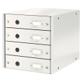 Moderný design, ktorý vyzerá skvelo doma i v kancelárii. Box so 4 zásuvkami pre formát dokumentov A4. Kovový úchyt na vytiahnutie zásuvky, rámik na popisovací štítok, laminovaný povrch. V prípade nepoužívania sa dá rozložiť. Rozmery 286 × 282 × 358 mm. Farba biela.